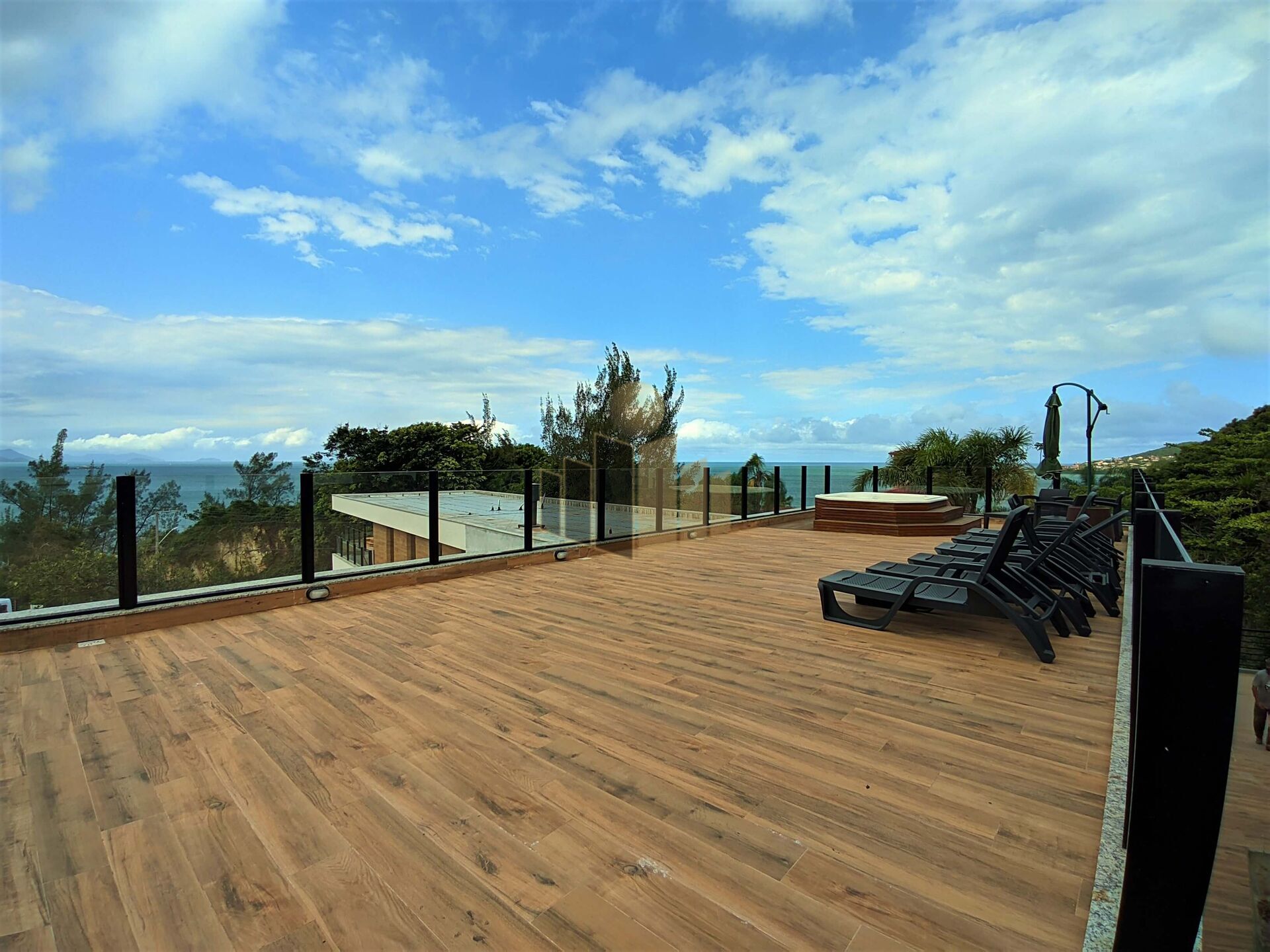 Tendo no pavimento superior quatro suítes sendo uma master, e todas interligadas por uma ampla varanda coberta conjugada a um solarium exclusivo munido de deck com spa, tendo vista fantástica para o mar.