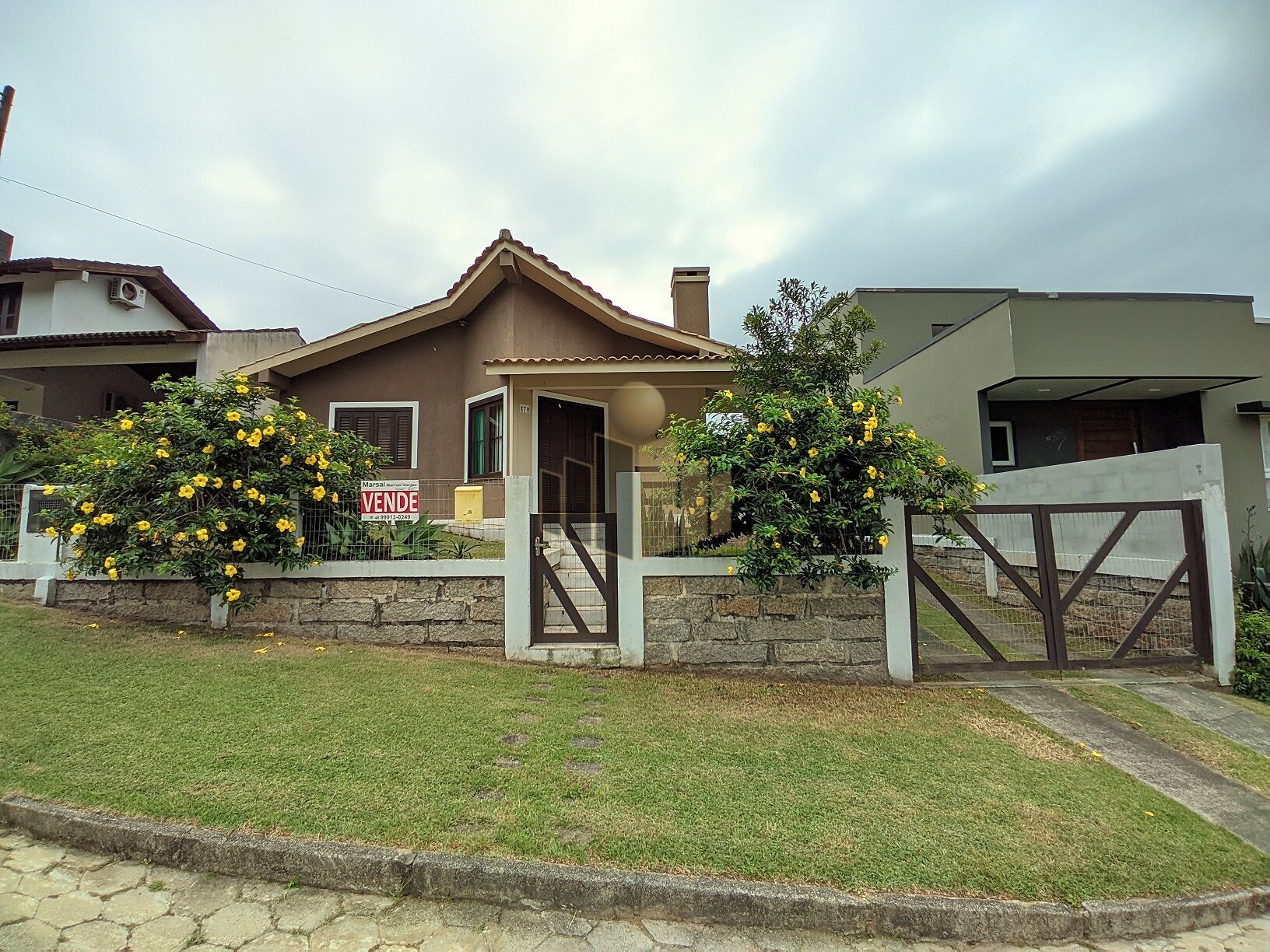 São 2 dormitórios sendo 1 suíte, sala com lareira, banheiro, cozinha, área de serviço, garagem coberta com churrasqueira, varanda .